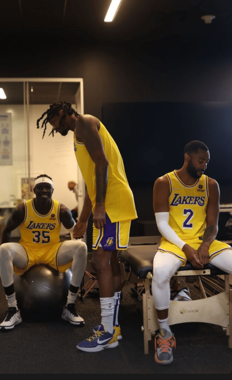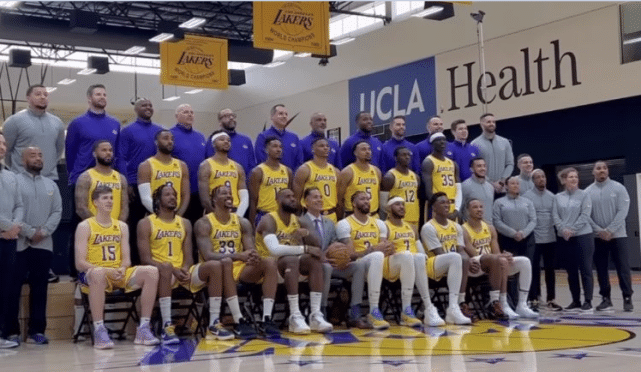 从湖人全队合影可以看出,里夫斯、阿里扎、霍华德、詹姆斯、佩林卡、浓眉、安东尼、斯坦利-约翰逊和布拉德利依次坐在前排;湖人总经理佩林卡抱球坐C位,詹眉坐其两侧。