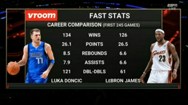 对于37岁的詹姆斯来说,他似乎真的有种无力感。这是东契奇生涯的第246场比赛,比赛中前方晒出了他和詹姆斯生涯前245场比赛的数据对比,东契奇明显占上风。东契奇生涯前245场常规赛战绩:134胜111负;詹姆斯则为126胜119负。东契奇期间数据为场均26.1分8.5篮板7.9助攻,121次两双;詹姆斯则为26.5分6.6篮板6.6助攻,61次两双。