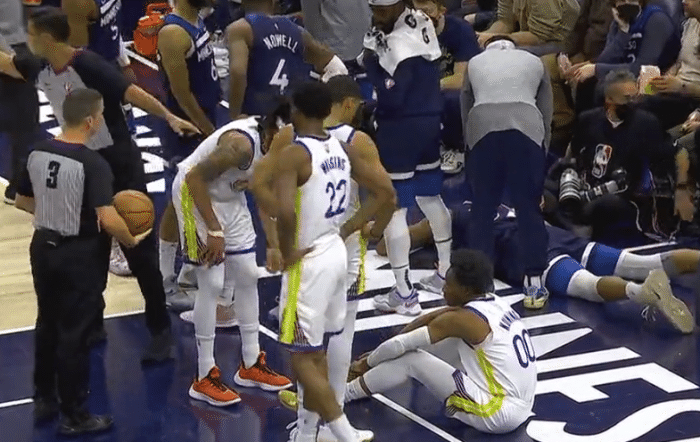首节的比赛开始后,唐斯和贝弗利连续命中三分球,勇士这边维金斯手感不错,他前3次出手全部命中得到了8分,唐斯连续冲击篮下得手,两队比分一度来到了12:12平,穆迪面对贝弗利三分命中,贝弗利三分回应,库里造成了唐斯个人第二次犯规,库里连得5分,勇士取得了比分上的领先,穆迪遭遇到伤病,随后返回更衣室接受治疗,随后官方发布消息称:穆迪在比赛中被唐斯打到眼部,本场不会回归。