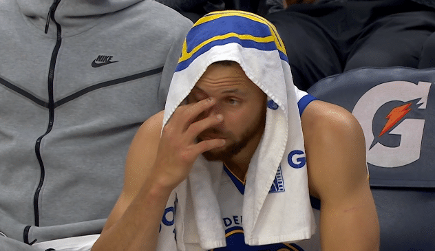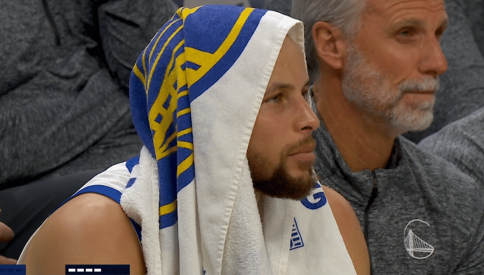 178直播03月02日讯 ,勇士客场对阵森林狼,库里全场出战33分钟,20投10中、三分16中5、罚球9中9拿到34分5篮板4助攻,第三节独砍16分带队反扑,无奈末节崩盘,提前6分钟放弃比赛,坐在替补席,毛巾盖头一脸无奈,十分郁闷。