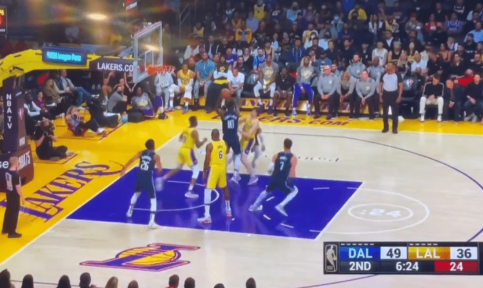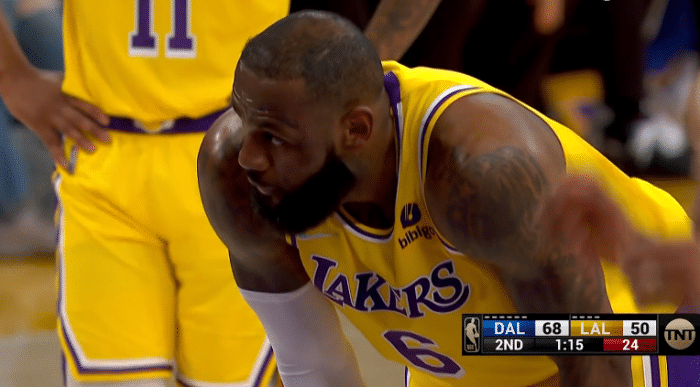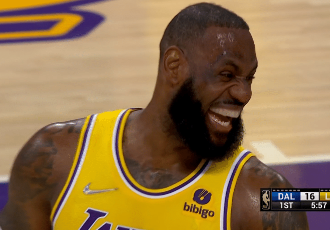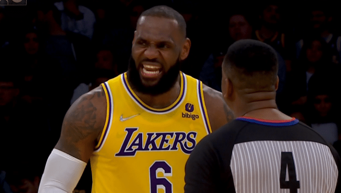 首节比赛,湖人25-30落后5分,詹姆斯第一节的心情很轻松,镜头拍到老詹咧嘴大笑,可第二节湖人彻底被打爆,进攻哑火防守犹如纸糊一般,独行侠外线三分没人防,一对一单防也被一步过掉;湖人落后到将近20分,第二节4分23秒,威少不满判罚,冲裁判握拳咆哮吃T,沃帅为威少出头也吃T,詹姆斯也找裁判讨说法。
