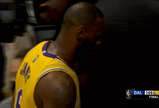 下半场,湖人第三节疯狂反扑,开场13-1追到仅落后3分,独行侠回应三分,之后詹姆斯外线开炮,三分越投越远,logo超远三分点燃球馆,连续3记三分让湖人女老板珍妮-巴斯乐开怀;下场休息时,詹姆斯累的直接累瘫倒,躺进替补席。