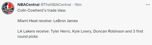 詹姆斯在昨天的比赛中出现7次失误,当他发生第6次失误时,湖人主场出现明显的嘘声。名嘴Colin Cowherd在节目上谈到了交易詹姆斯的可能,并列出了他建议的热火6换1方案:热火送出希罗、洛瑞、邓肯-罗宾逊和3个首轮签,从湖人换来詹姆斯。当然,这只是他的个人观点。名记文霍斯特也在节目上透露,联盟里的资深人士认为湖人应该把詹姆斯和浓眉都交易出去。