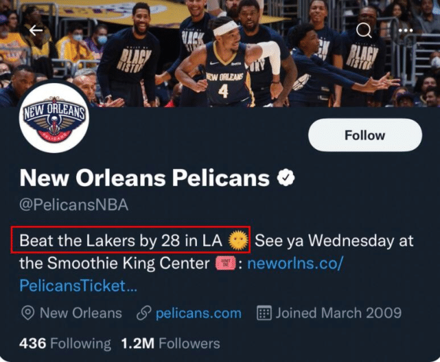 湖人以28分之差输给鹈鹕,也让这个对手颇为得意。他们甚至修改了官方的社媒介绍,将“在洛杉矶28分击败湖人”写进了球队信息里,引起热议。