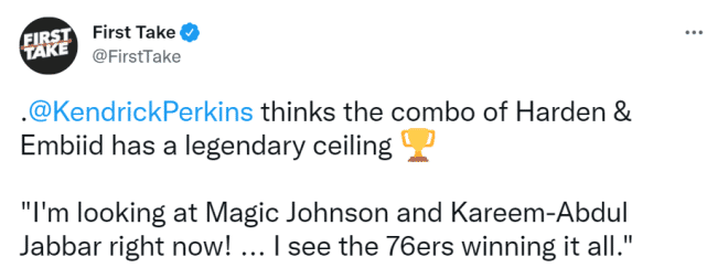 178直播03月01日讯 自从哈登加盟费城76人后,球队两战全胜。哈登和恩比德的状态都非常出色,两场比赛,哈登场均28分9篮板14助攻,恩比德场均35.5分9.5篮板2盖帽。北京时间3月1日,名嘴帕金斯在最新一期的FIRST TAKE节目上预测费城本赛季夺冠,并认为哈登和大帝的组合就是当代的魔术师+天勾。