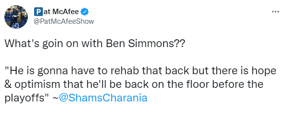 178直播03月01日讯 篮网新巨头西蒙斯何时能够复出?shams表示西蒙斯将会养伤,但乐观的是他将在季后赛前重返赛场。
