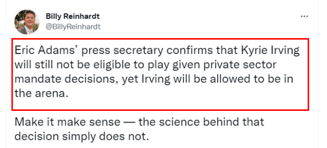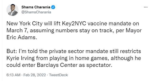 纽约市长埃里克-亚当斯宣布计划在3月8日(北京时间)取消纽约的疫苗接种要求,名记查拉尼亚报道称,受私营部门限制,欧文依然不被允许出战主场,但他可以进入巴克莱中心观战。随后,市长秘书确认欧文依然不能打主场。篮网白高兴一场!