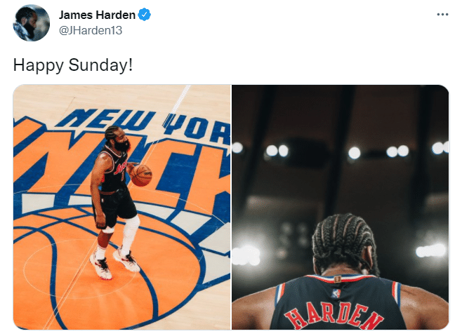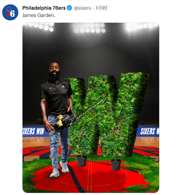76人官方恶搞哈登修剪草坪,晒恶搞图并发推写到:James Garden;赛后哈登晒赛场照,并且发推写到:周日快乐!