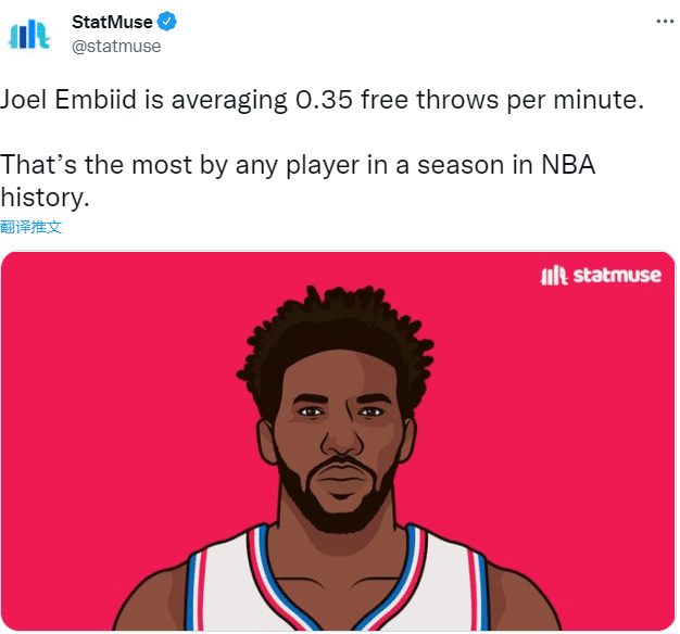 第七、恩比德本赛季每分钟能创造0.35次罚球,为联盟历史上单赛季个人球员的最高