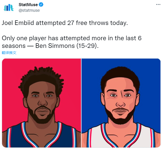 第四、恩比德单场27罚,过去6个赛季仅次于他的前队友西蒙斯,本西曾在2017年11月30日对阵奇才的比赛中,单场罚球29次。