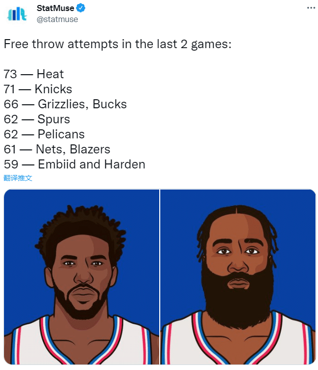 178直播02月28日讯 ,据统计,过去两场比赛中,哈登和恩比德共计罚球出手59次,比联盟其他21支球队的最近两场罚球总出手数都要高。