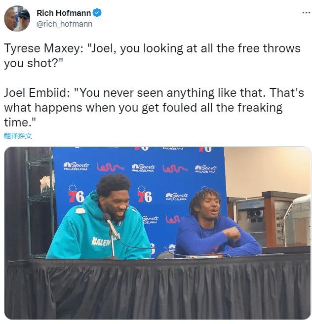 赛后谈到本场罚球数,恩比德表示:你从来没有见过这样的事情,当你一直被犯规时,就会发生这种情况;谈到与哈登一起打球时,恩比德表示我与哈登的二人组不可阻挡。