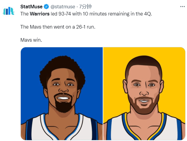 末节还剩10分钟勇士领先19分,之后被独行侠打出26-1超级攻势,最终独行侠拿下胜利;美媒晒出勇士连胜纪录遭终结,据统计当勇士领先20+时他们已经豪取62连胜,可今晚惨遭21分逆转后,勇士62连胜被终结,美媒更是晒出库里的沮丧表情,脸色铁青太难受。
