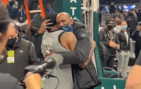 比赛结束之后,篮网赢球功臣、独砍38分的欧文非常开心,他在场边与父亲紧紧相拥庆祝胜利。