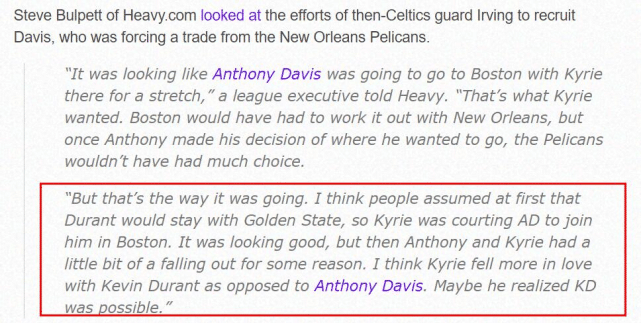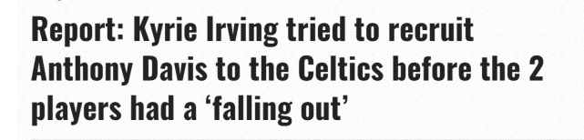 据美媒Heavy的记者Steve Bulpett报道,欧文当年效力绿军时,曾招募过安东尼-戴维斯,但最终两人发生了一些争吵,未能成功联手。Steve Bulpett指出,两人争吵的原因或许和杜兰特有关。