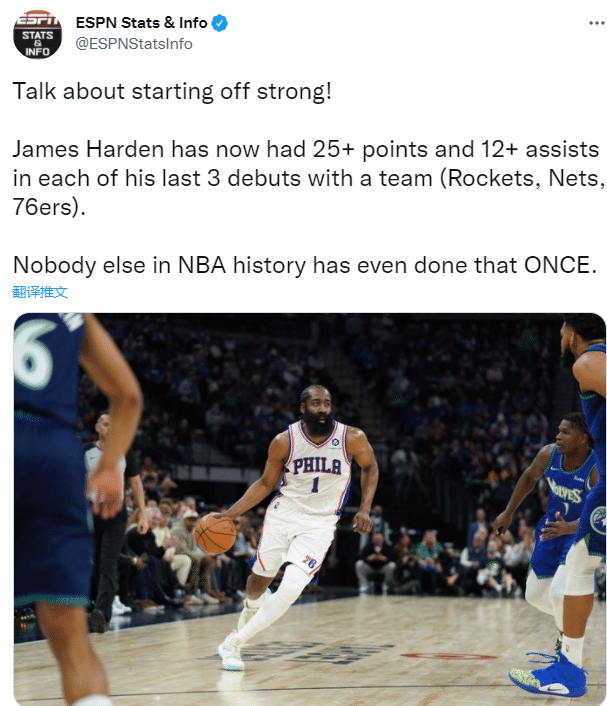 哈登成为NBA历史上第一位在三支球队首秀至少轰下25+12的球员,该纪录历史第一人。