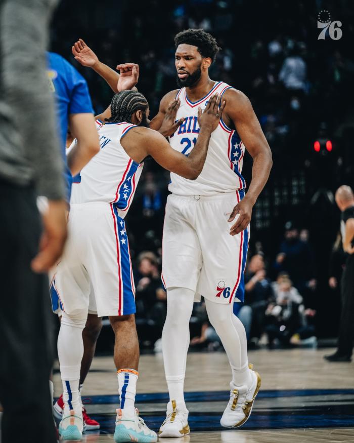 下半场,76人第三节牢牢掌控比赛,甚至领先到20分以上,末节唐斯想带队起势,结果哈登迎着唐斯打成不讲理3+1,紧接着再中三分,比赛还剩4分25秒,76人领先27分,哈登和恩比德都提前打卡下班,两人并肩坐在替补席,开心互动交流。