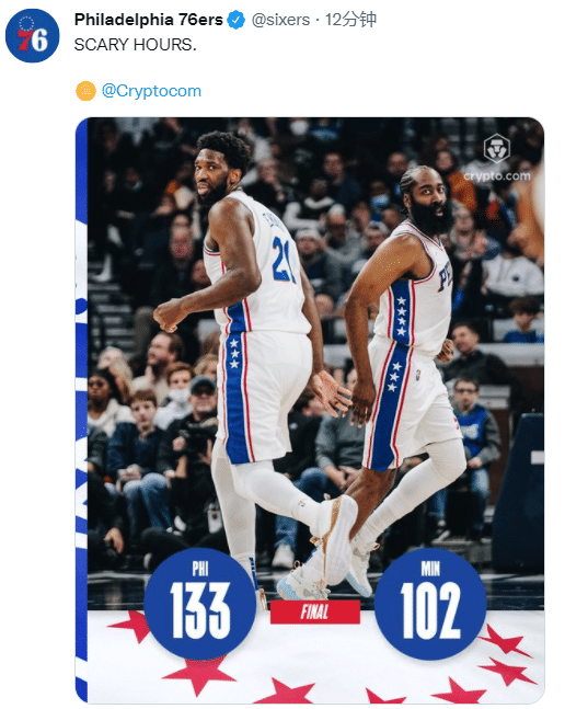 76人官方晒恩比德和哈登同框合影,高呼口号:恐怖时刻。