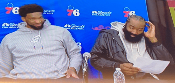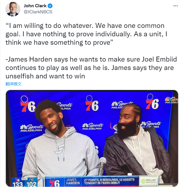 谈到与恩比德等队友一起打球,哈登表示:我愿意做任何事情。我们有一个共同的目标(总冠军)。我没有什么需要单独证明的,作为一支球队,我认为我们有一些东西要证明。