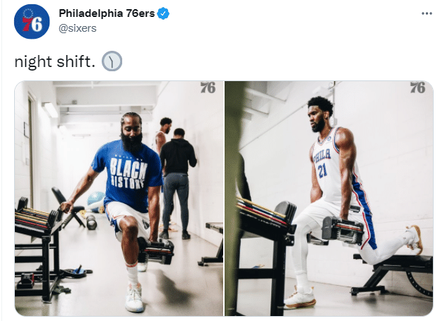 76人官方晒出哈登和恩比德赛后在健身房苦练的画面——哈登身穿蓝色T恤,恩比德则是穿着21号球衣,他俩赛后一起撸铁苦练力量;76人官推写道:夜班。