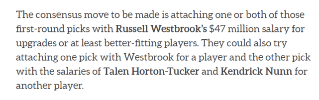到了今年休赛期,湖人可以交易的首轮签增至两个:2027年和2029年,他们还有多达8个次轮签可以交易。外界普遍认为,湖人可以用一两个首轮与威少的4700万美元薪金组合报价,得到一位更适合湖人的球星。湖人也可以用威少和一个首轮签换一名球员,用另一个首轮搭上霍顿-塔克和纳恩的合同换另一名球员。