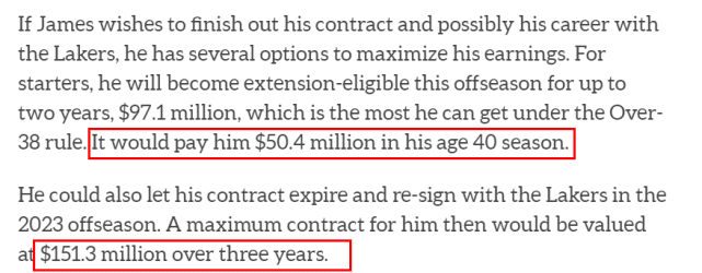 如果詹姆斯打算和湖人继续合作,甚至在湖人退役,他的面前有不同的选择。首先,他在今年休赛期具备了提前续约的资格,可以在38岁规则下最多签到2年9710万美元的合同。这意味着詹姆斯40岁的赛季依然能拿到5040万美元的薪水。