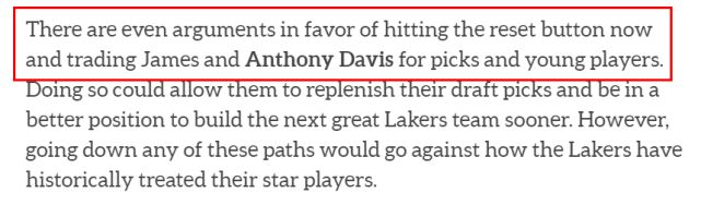 如果詹姆斯计划在2022年休赛期离开湖人,向球队申请交易,湖人能够安抚他的做法就是不得不把剩余不多的资产去换回一些新援,争取留住詹姆斯,即便他们认为回报不会明显提升他们夺冠的几率。