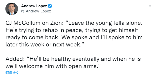 178直播02月25日讯 ,鹈鹕新援CJ-麦科勒姆谈到外界对锡安的批评,他表示:别再影响这个年轻人了。他正在尝试平静地康复,试图让自己做好回归的准备。我们谈过了,我将在本周晚些时候或下周和他谈;他最终会健康的,当他健康的时候,我们会张开双臂欢迎他。
