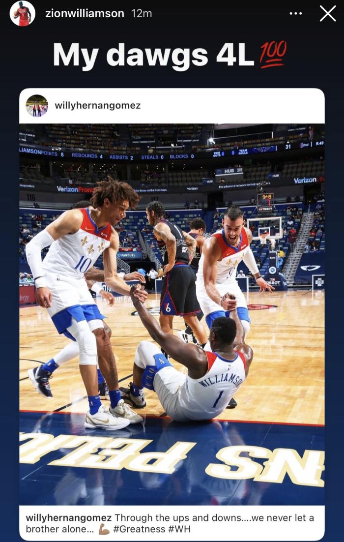 此前锡安雷迪克狠批对队友冷漠,如今锡安本人已经做出了回应,埃尔南戈麦斯晒出一张他和海斯拉起锡安的照片,并且配文写道:经历起起落落....我们从不让兄弟独处;对此锡安转发并且回复:一辈子的兄弟。
