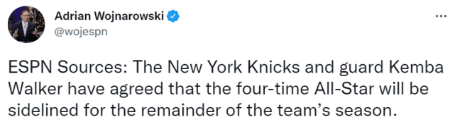据ESPN名记沃纳罗斯基报道,31岁的肯巴-沃克已经与尼克斯达成协议,本赛季余下比赛不再出战。他将全力备战2022-23赛季。沃纳罗斯基表示,沃克有可能在今年休赛期被尼克斯交易。