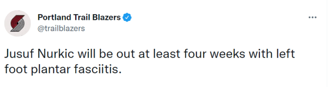 目前,开拓者排名西部第10位,处于附加赛的边缘。他们原本前景光明,因为拥有西部余下最轻松的赛程,但随着努尔基奇的伤停,这支球队的未来又多了一些不确定性。