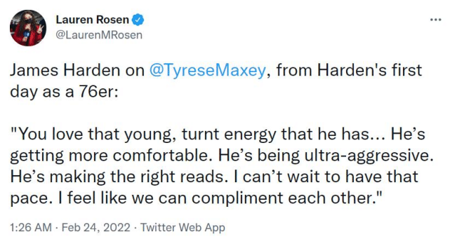 加盟费城,不但意味着哈登将和恩比德联手,而且意味着他的后场拍档换成了年轻的马克西。哈登非常看好这位年轻人的未来。“你喜欢他年轻,充满活力的样子,他正打得越来越得心应手,他非常有侵略性,在场上也能正确阅读比赛。我已经等不及了,我觉得我们会有很好的化学反应。”