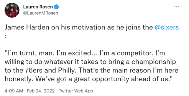 此前,哈登已经表示自己拿到了绝大多数个人荣誉,最迫切想要的就是一座总冠军奖杯,而他向篮网申请交易到费城,也是冲着这个目标而来。接受采访谈到加盟76人的动力时,哈登说道:“我很激动,我是一个竞争者,我愿意付出一切为76人和费城带来总冠军,这是我来到这里的主要原因,在我们面前,就有一个很好的机会。”