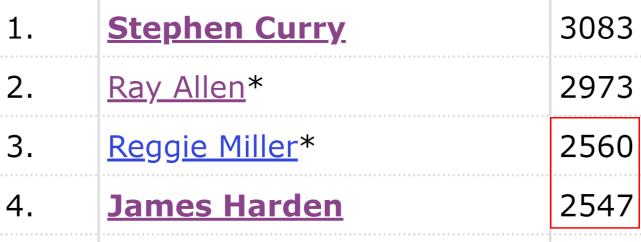哈登将在北京时间2月26日迎来76人生涯的首秀,与此同时,他也正在接近解锁一项新的里程碑。数据显示,哈登目前已经命中2547记三分球,排名历史第四位,他只需要再进14记三分,就能超越雷吉-米勒(2560记),升至历史第三位。目前排在第一的是库里(3083记),第二是雷-阿伦(2973记)。