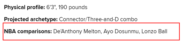 247体育为布朗尼列出的最新排名,是在第34位,而选秀报告显示他的三个模板分别是效力于灰熊的梅尔顿、效力于公牛的球哥以及同样效力于公牛的多森姆。他的主要角色是串联者和3D相结合。