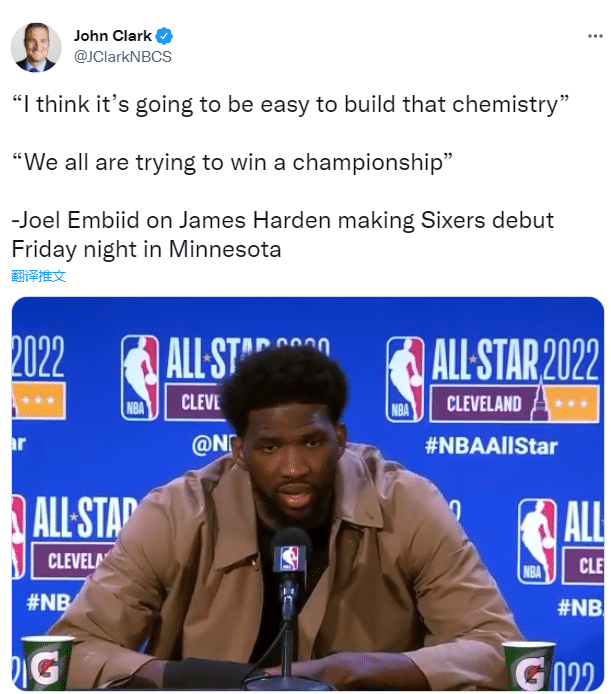 谈到哈登76人首秀,恩比德表示:哈登拿过联盟的MVP,还有得分王。我认为会很容易和他构建化学反应。大家都处于同一战线,我们都试图赢下总冠军,那就是我们的目标。我希望大家都能够保持健康,在场上团结一致,一起比赛。