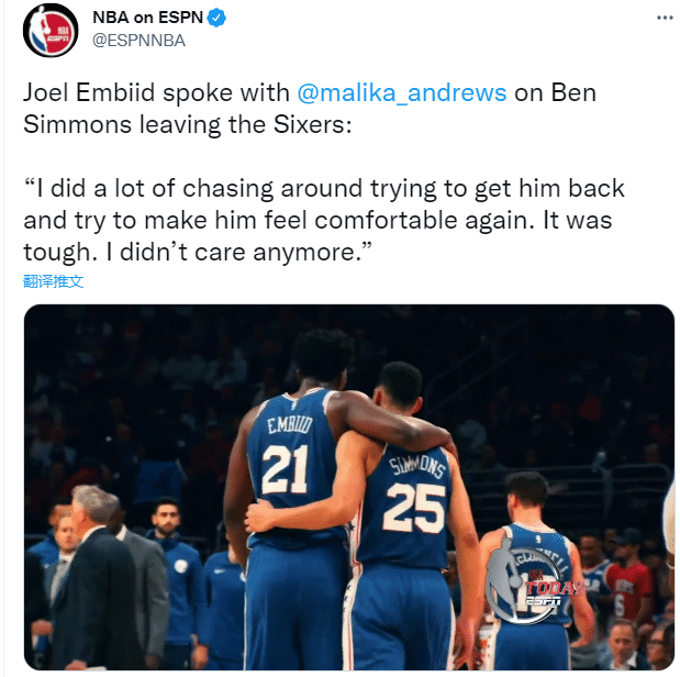 178直播02月23日讯 再次谈到西蒙斯,恩比德表示:我们最后一次谈话是在交易截止日期前的一两周,他是一个出色的球员,我认为无论他给布鲁克林带来什么,他都会把那支球队带到另一个水准;我已经竭尽全力,试图让他回到球队,试图让他再次感到舒适,这很艰难,我现在已经不在乎了。