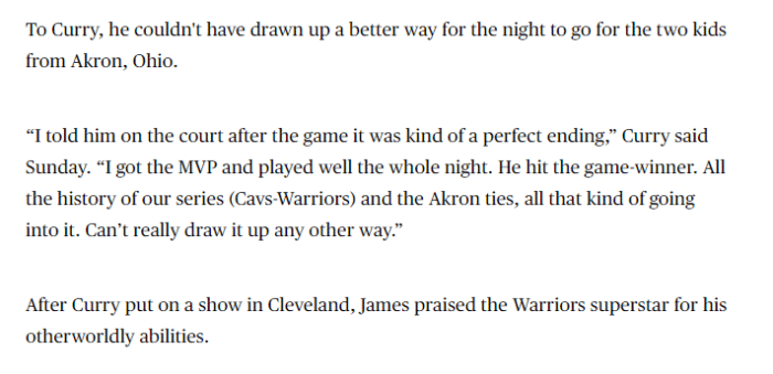 库里还表示:我们之间的系列赛(骑勇大战)、阿克伦的情结,所有这些都融入到了这场比赛,没有比这更好的结局了。