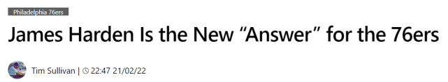 费城媒体认为,哈登将成为费城一系列问题的答案。他在训练中已经展现了良好的精神状态,而且腿筋问题似乎也不再困扰着他。他们把换来哈登称为费城自引进摩西-马龙后最成功的交易。费城媒体也相信,和恩比德联手,将让哈登获得生涯中赢下总冠军的最佳机会,甚至比2018年的火箭更有希望。