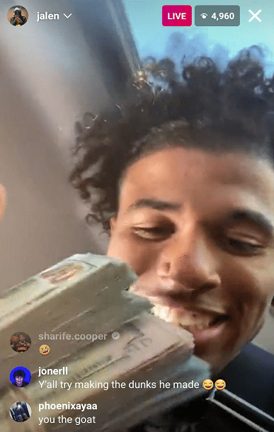 178直播02月22日讯杰伦-格林没有比赛任务,在度过了全明星周末之后,杰伦-格林开启了直播,只见他手拿大沓现金炫富。直播中的杰伦-格林非常开心,有数千人观看这位火箭榜眼的直播。