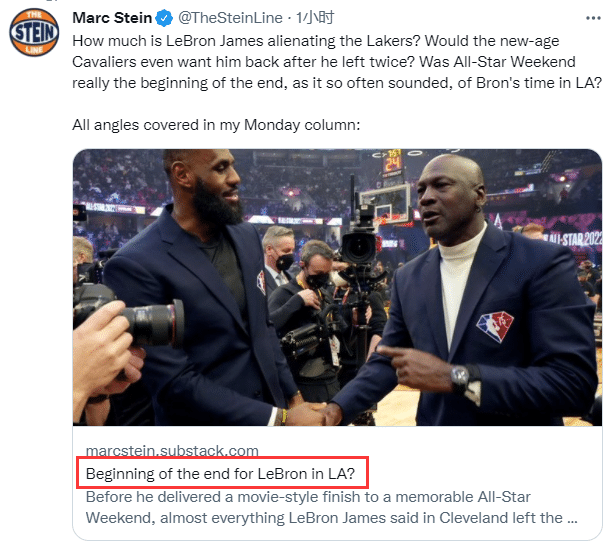 178直播02月22日讯 ,克利夫兰全明星周末已经结束了,但关于詹姆斯可能离开湖人的争议言论依旧在;名记Marc Stein撰文并发推写道:勒布朗-詹姆斯在多大程度上疏远湖人?在他两次离开后,新时代骑士会想要他回来吗?全明星周末真的像人们经常听到的那样,是勒布朗湖人生涯终结的开始吗?