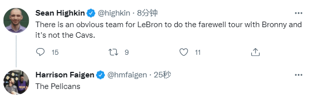 不久前美记者Sean Highkin发推写道很明显,詹姆斯和布朗尼不会在骑士队联手,湖人记者Harrison Faigen回复:鹈鹕(意外之意是詹姆斯父子会在鹈鹕联手)