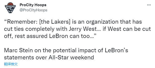 Marc Stein在文章中写道:虽然詹姆斯和里奇-保罗对湖人队有着明显的控制力,但在湖人力量方面,他们仍然是局外人,湖人是一支可以和杰里-韦斯特断绝关系的球队,如果韦斯特的关系可以被切断,肯定詹姆斯与湖人的关系也可以被切断。