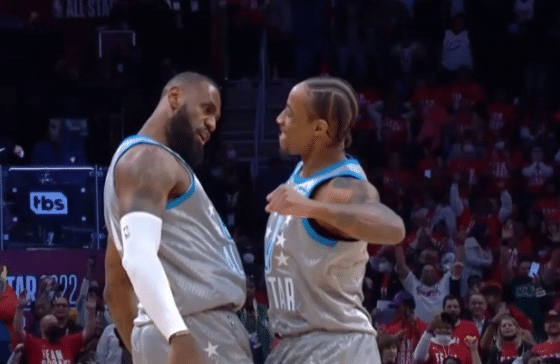 第四节的比赛,两队真刀真枪地开干,加兰德三分命中,库里顶着防守三分再中,个人本场比赛第16记三分球,两队进入拉锯战,比分交替领先,库里手感稍有下降,比分来到了155:155平,字母哥杀到内线飞身大拉杆得手,特雷-杨加长三分不中,詹姆斯上篮打中,恩比德上篮,詹姆斯大帽,库里三分不中,德罗赞翻身跳投命中,拉文篮下打中,库里超远三分没有,拉文追身三分命中,詹姆斯翻身大后仰绝杀比赛,詹姆斯队163:160战胜了杜兰特队,全场球迷爆发出巨大的欢呼声,詹姆斯队保持全明星百分百胜率。