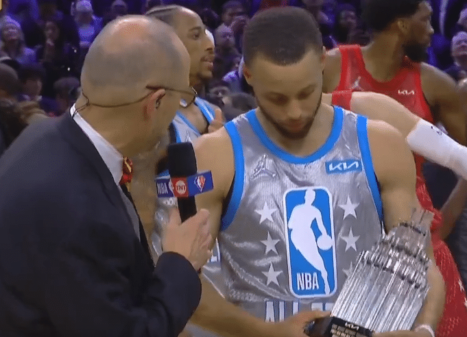 赛后,库里没有什么悬念的获得了MVP,不得不说库里的MVP,要感谢詹姆斯的绝杀。今天的比赛,库里创下了4项纪录,8记三分创全明星半场三分纪录,6记三分创全明星单节三分纪录,全明星三分命中数历史第一、全明星单场三分命中纪录。