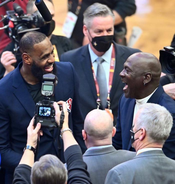 詹姆斯和乔丹紧紧拥抱并且有说有笑聊起来,两大传奇人物同框出镜引热议,湖人官方第一时间晒出乔丹和詹姆斯的合影,并且配上两个山羊(GOAT历史最佳)表情,湖人官推言外之意就是詹姆斯和乔丹两人都是历史最佳。