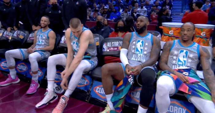 第一节,詹姆斯队和杜兰特队展开对攻大战,詹姆斯、字母哥、莫兰特等人疯狂暴扣,库里没扣篮却送出两次大帽——接连大帽维金斯和塔图姆,库中锋还投进两记三分。