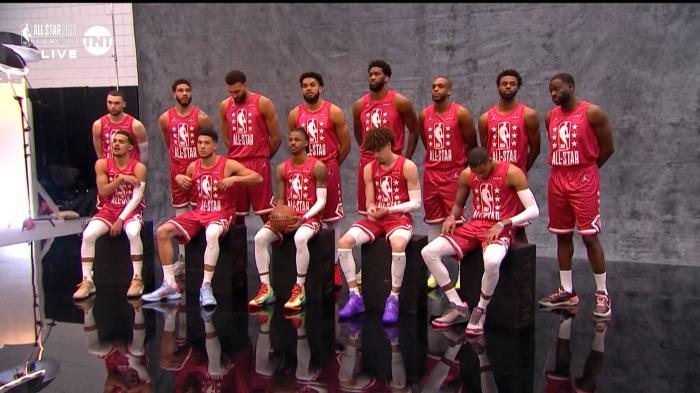 178直播02月21日讯 ,2022年克利夫兰全明星周末最后一天,全明星正赛来了,赛前全明星赛杜兰特队大合影正式出炉,杜兰特队杜兰特缺席,莫兰特抱球C位亮相,恩比德和唐斯站在一起。