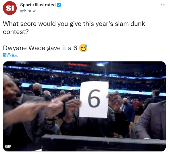 扣篮大赛结束后,镜头给到场边,韦德先是举着9分,然后把纸翻转过来,给这届扣篮大赛仅打6分,雷吉-米勒等人指着6分,随后韦德咧嘴哈哈大笑;韦德玩9分梗,最终给扣篮大赛打6分,今年真该让韦德继续当评委,估计他的表现会比球员的扣篮更精彩。