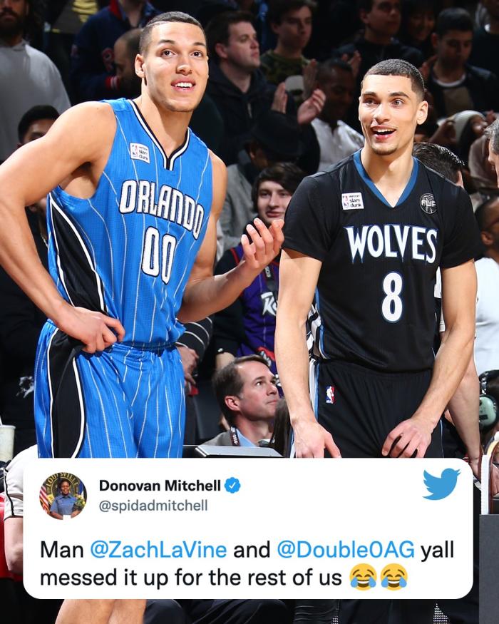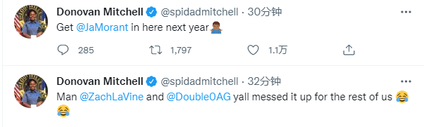 爵士球星米切尔发推写道:兄弟@拉文 @戈登,你们把扣篮大赛搞砸了,让我们其他人怎么办;米切尔还希望莫兰特能参加下一届扣篮大赛。
